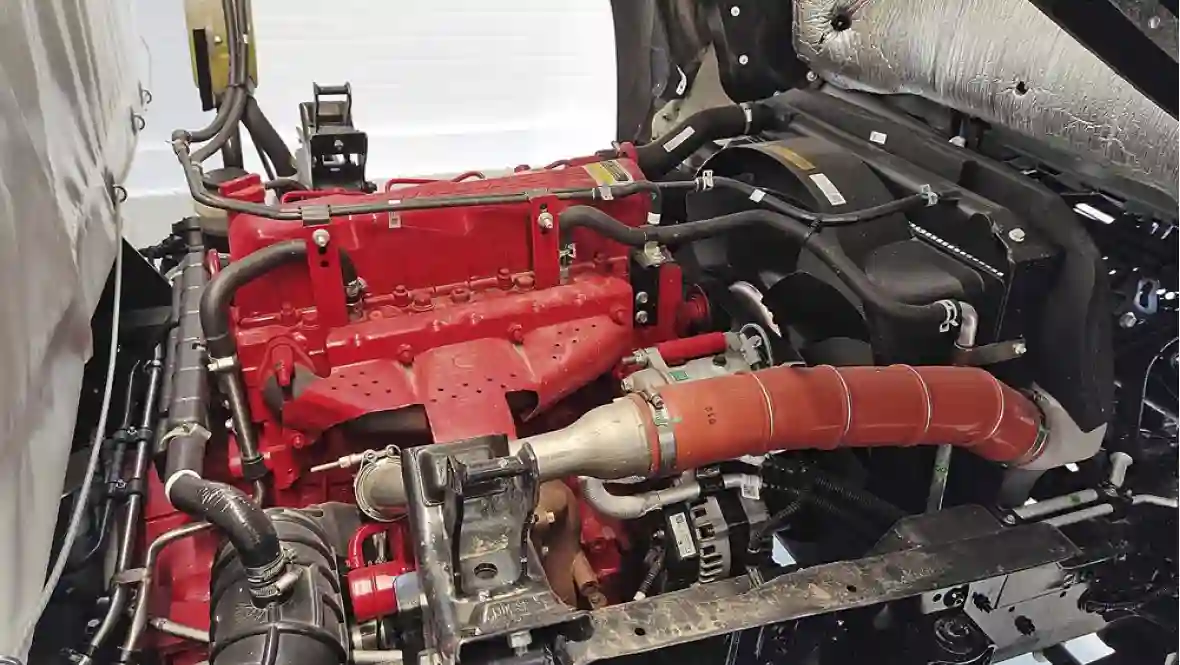 Кабина легко поднимается руками. Под кабиной 4-цилиндровый рядный турбированный дизель ISF3.8s5154 с рабочим объемом 3,76 л и мощностью 152 л.с. при 2600 мин-1. Дизель экологического уровня «Евро-5» с мочевиной, но без сажевого фильтра. Предусмотрено место для установки компрессора холодильно-отопительной установки. Алюминиевый 200-литровый топливный бак обещает внушительный запас хода.
