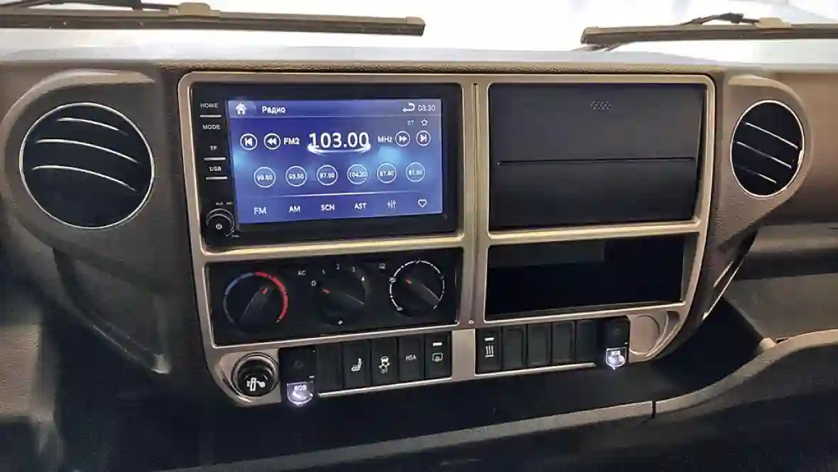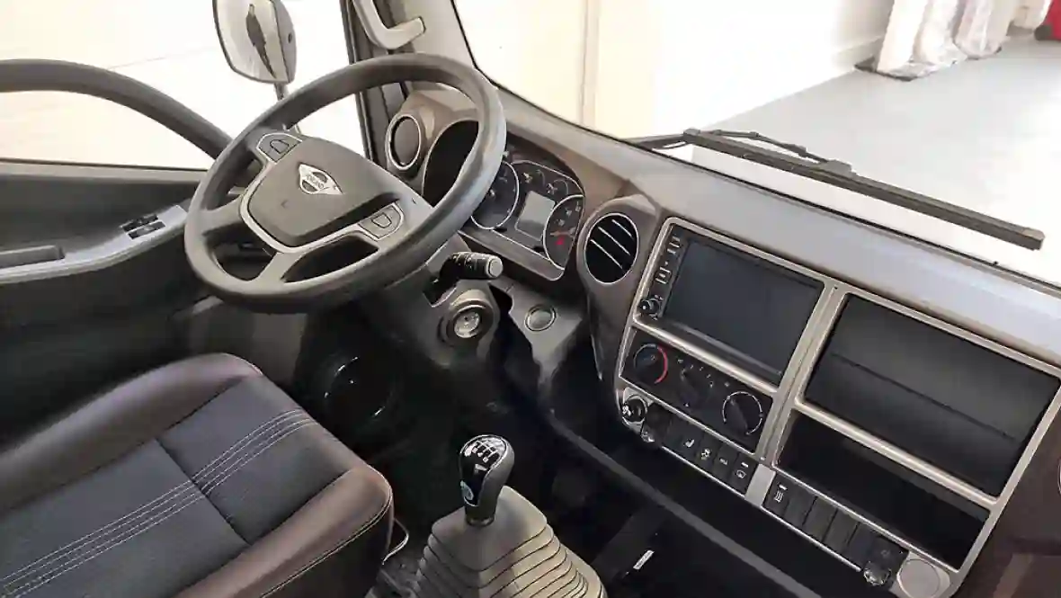 Кабина оборудована подрессоренным водительским сиденьем с подогревом. Жесткость подвески сиденья можно отрегулировать под вес водителя. Подогрев – элемент российской комплектации. Регулировки сиденья, форма спинки и регулировки рулевой колонки по наклону и вылету позволяют удобно устроиться. Плюс удобное расположение рычага переключения передач – не нужно к нему даже чуть-чуть тянуться или наклоняться.