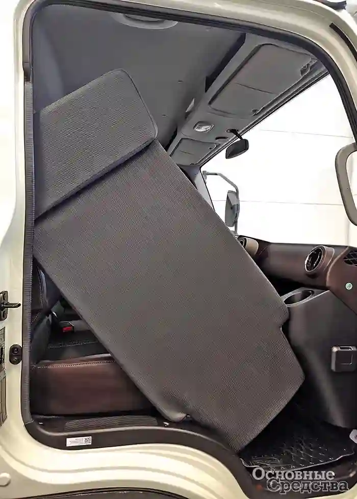 К удобствам, несомненно, относятся штатный кондиционер, локализованная мультимедийная система с камерой заднего вида и поддержкой протокола Bluetooth, круиз-контроль. Управлять круиз-контролем и мультимедийной системой можно с многофункционального руля. Четырехспицевый руль явно заимствован с легкового автомобиля, только кожей не обшит. В дверях предусмотрены карманы для хранения мелочей, на месте правого подлокотника объемный ящик, попутно выравнивающий поверхность между сиденьями. Вот так плавно мы подошли к главному – к матрасику. Кабина трехместная дневная без намека на «спальник», но за спинками хранится матрасик, который в рабочее положение укладывается на сиденья, образуя достаточно широкую и ровную лежанку. Напомним, что внутренняя ширина кабины составляет 2026 мм, так что места достаточно.
