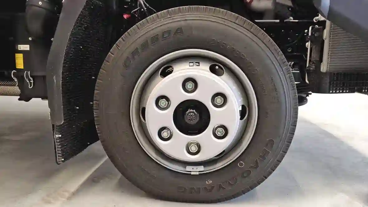 На осях использованы шины размером 215/75R17.5, на задней оси – двускатная ошиновка. Запаска подвешена снизу в заднем свесе. Выковырять ее оттуда будет челленджем особого рода. Кузовщикам стоило бы поломать голову над более удобным размещением запасного колеса.