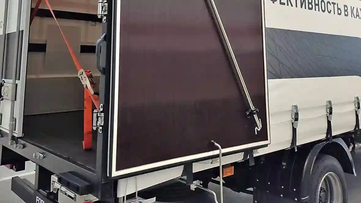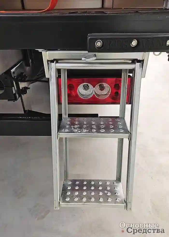 Для подъема в кузов предусмотрены выдвижная лесенка и ручка на боковом профиле. Багор для сдвижной крыши хранится в специальных скобах с внутренней стороны воротины.
